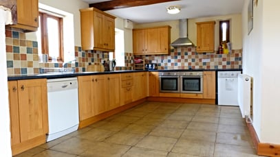 A beautiful, very spacious and well equipped kitchen with a double electric oven and hob, microwave, dishwasher, fridge and a freezer. A utility room with a second fridge and a freezer, washing machine and a separate toilet. The dining area is large enough to comfortably accommodate 15 people. There are comfortable sofas and chairs set around a very efficient new woodburning stove, TV with DVD. Double doors lead out to a terrace with garden furniture and the most extraordinary panoramic views over to the Brecon Beacons.
